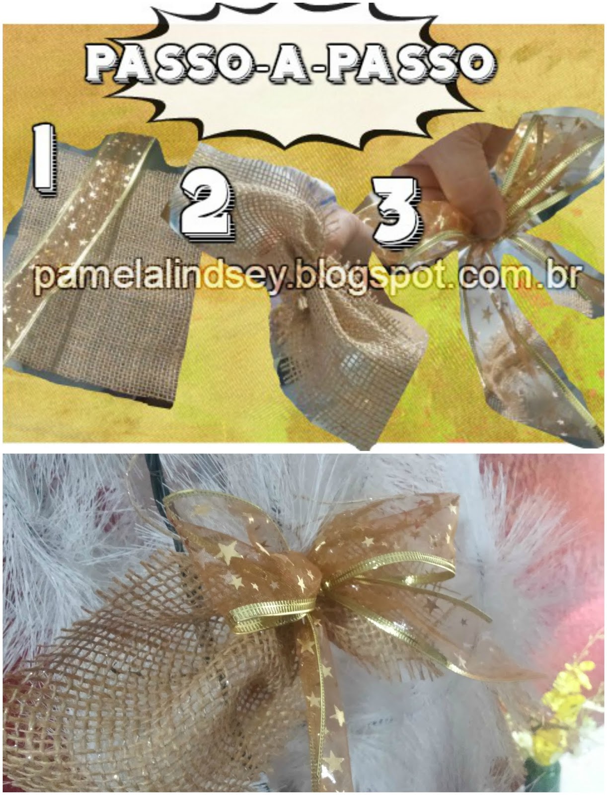3)Depois faça um tope com a fita natalina e a amarre junto a juta,se quiser você pode pôr algum pequeno enfeite dentro do tope!
